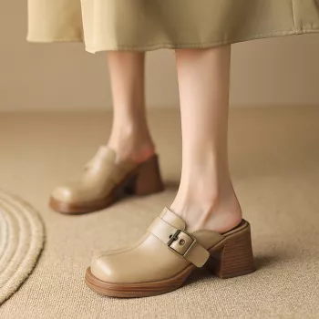 Elegant Summer Leather Mules for Women – Retro Slip-On Heels with Buckle